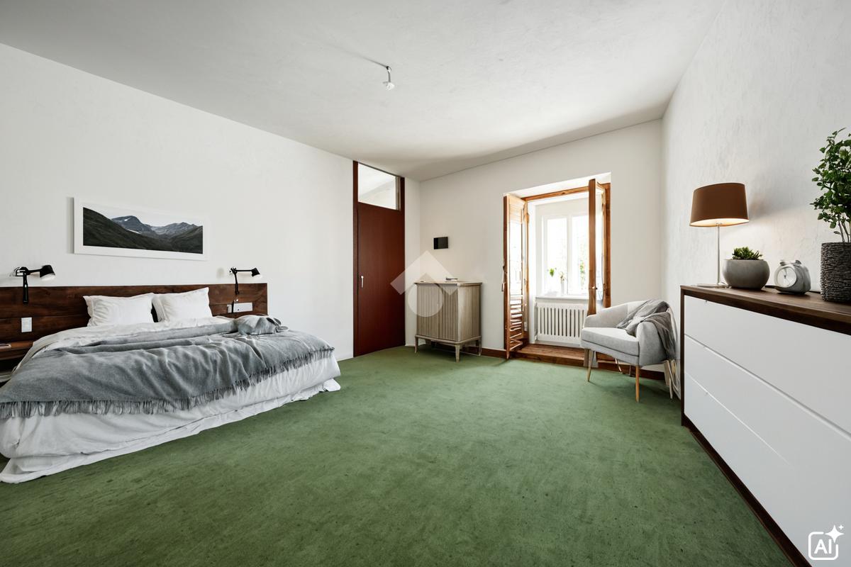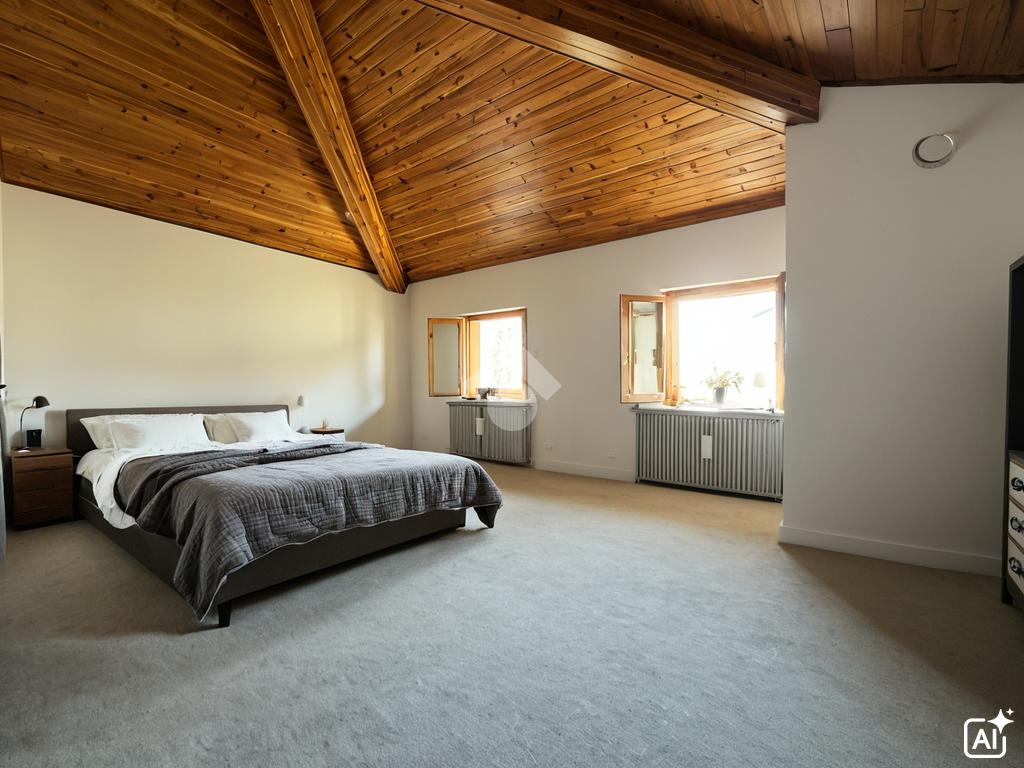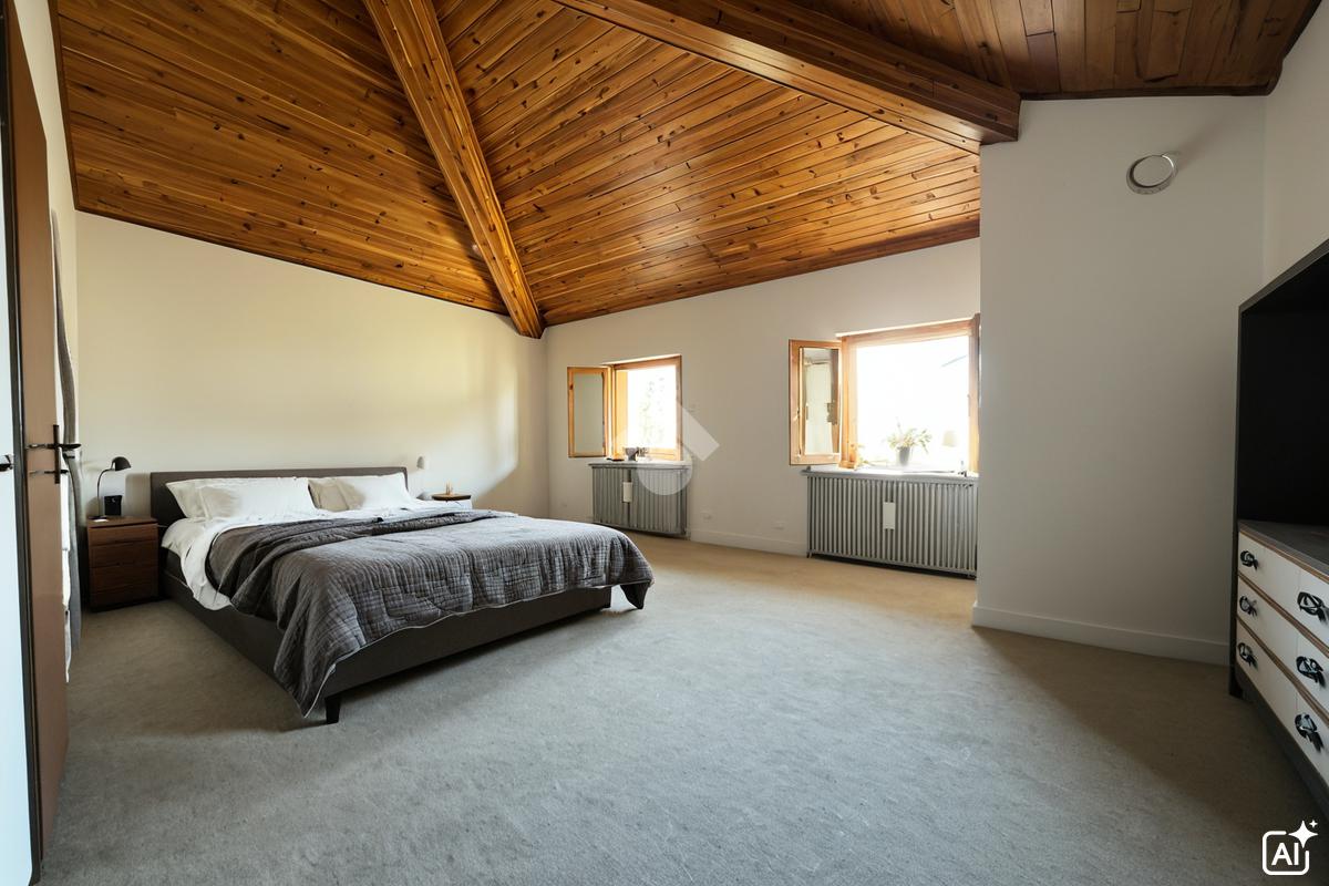 Dalla zona giorno si accede anche al bagno principale, piastrellato e completo di box doccia, e a una spaziosa camera matrimoniale. Un ulteriore disimpegno conduce a un pratico ripostiglio e a una seconda camera da letto rialzata, dotata di un secondo bagno privato, garantendo massima privacy e comfort.