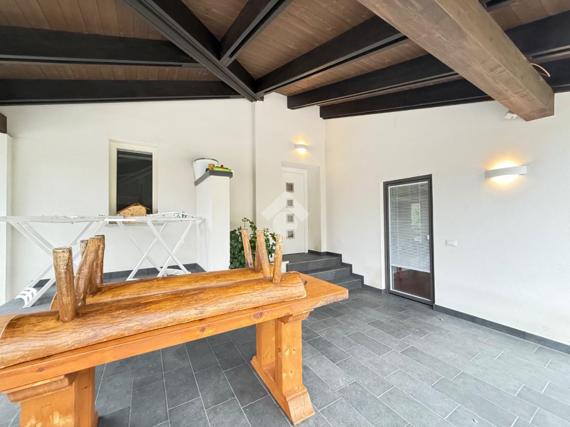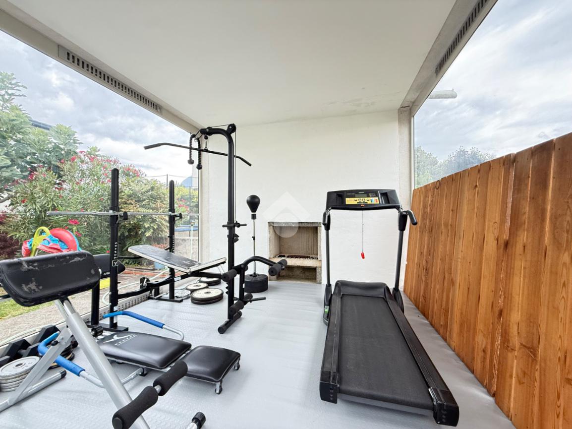 L’accesso alla proprietà avviene tramite cancello automatico. La villa si sviluppa su due livelli e dispone inoltre di una zona palestra coperta con affaccio sul verde, perfetta come area hobby, spazio fitness e box auto.